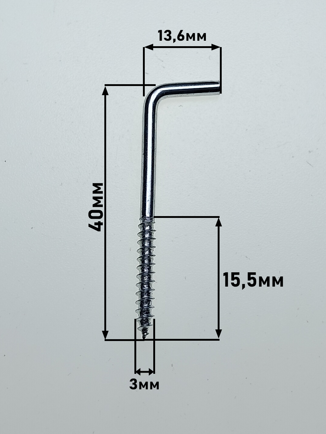 Г-образный шуруп-крючок размером 3×40 мм предназначен для надёжного крепления и подвешивания различных предметов на деревянные поверхности, а также на бетон и кирпич при использовании дюбеля. Широко применяется в быту, строительстве и при монтажных работах для установки светильников, крепления тросов, цепей, кабелей, инструментов и элементов интерьера.