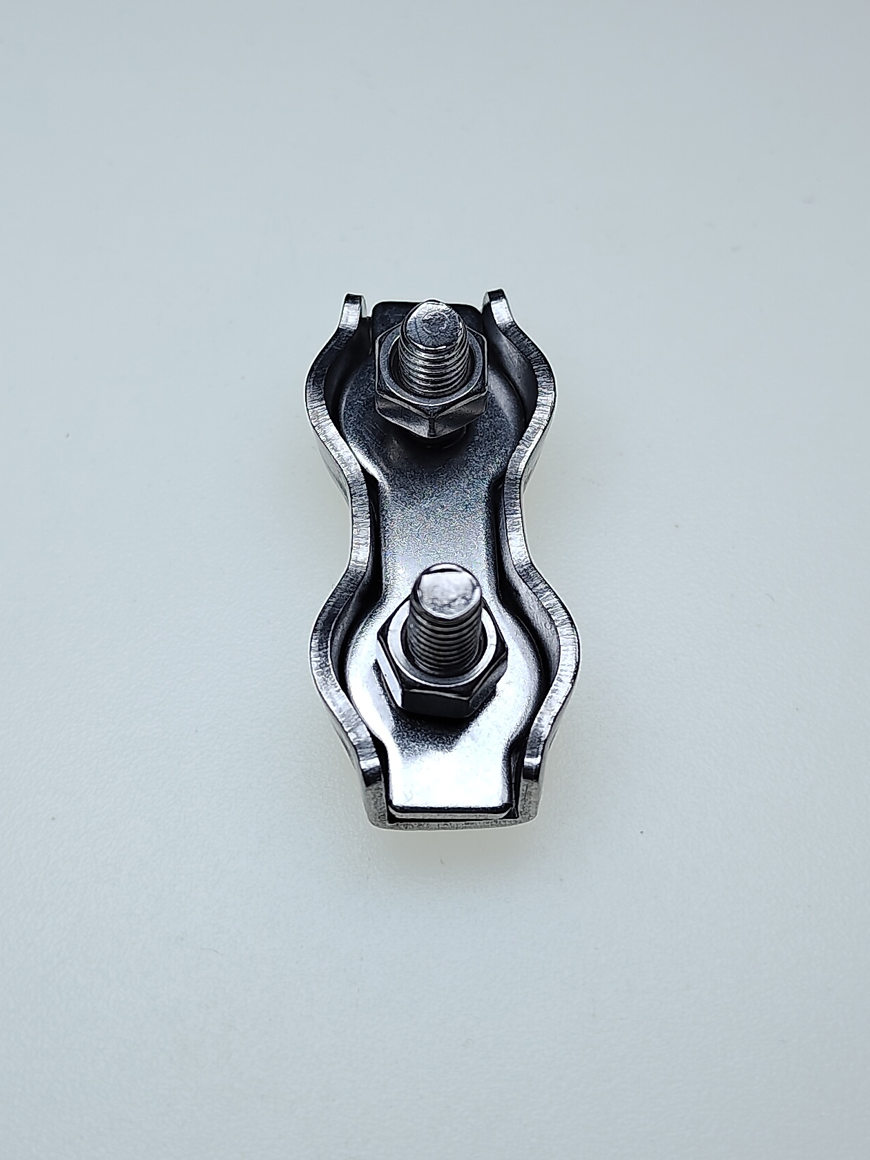 Изделие изготовлено из нержавеющей стали класса A2-70, что обеспечивает высокую коррозионную стойкость и устойчивость к воздействию влаги и атмосферных факторов. Соединитель состоит из корпуса и прижимных планок с болтами, которые обеспечивают надёжную фиксацию троса без его повреждения.